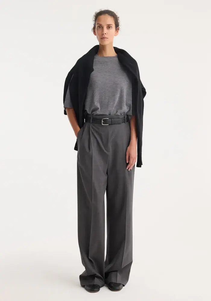 Crafted from a soft virgin wool fabric this trouser features front and back pleats for a structured silhouette. The high-waisted design with a tailored waistband makes them a versatile wardrobe staple for any occasion. Welt pockets at the back add a polished finish.