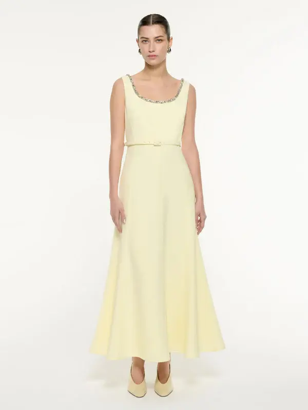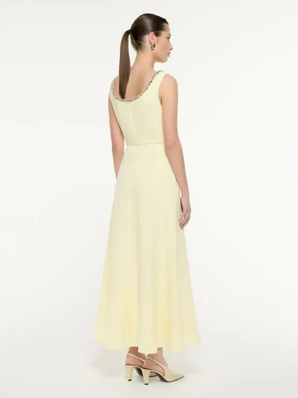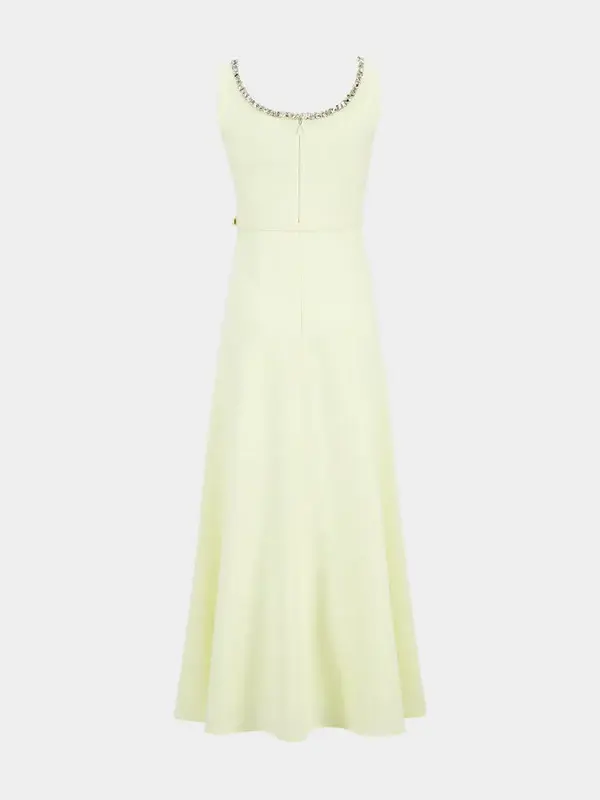 The Embellished Heavy Cady Maxi Dress in Light Yellow by Roland Mouret is a sophisticated evening gown that exudes elegance and modernity. Crafted from a luxurious blend of acetate and polyester, this sleeveless dress features a wide scoop neckline adorned with delicate diamante embellishments, adding a touch of sparkle to its minimalist design. The fit-and-flare silhouette is complemented by side seam pockets and a concealed back fastening, offering both style and functionality. Fully lined for comfort, this dress is a perfect choice for formal occasions or evening events, embodying contemporary luxury.