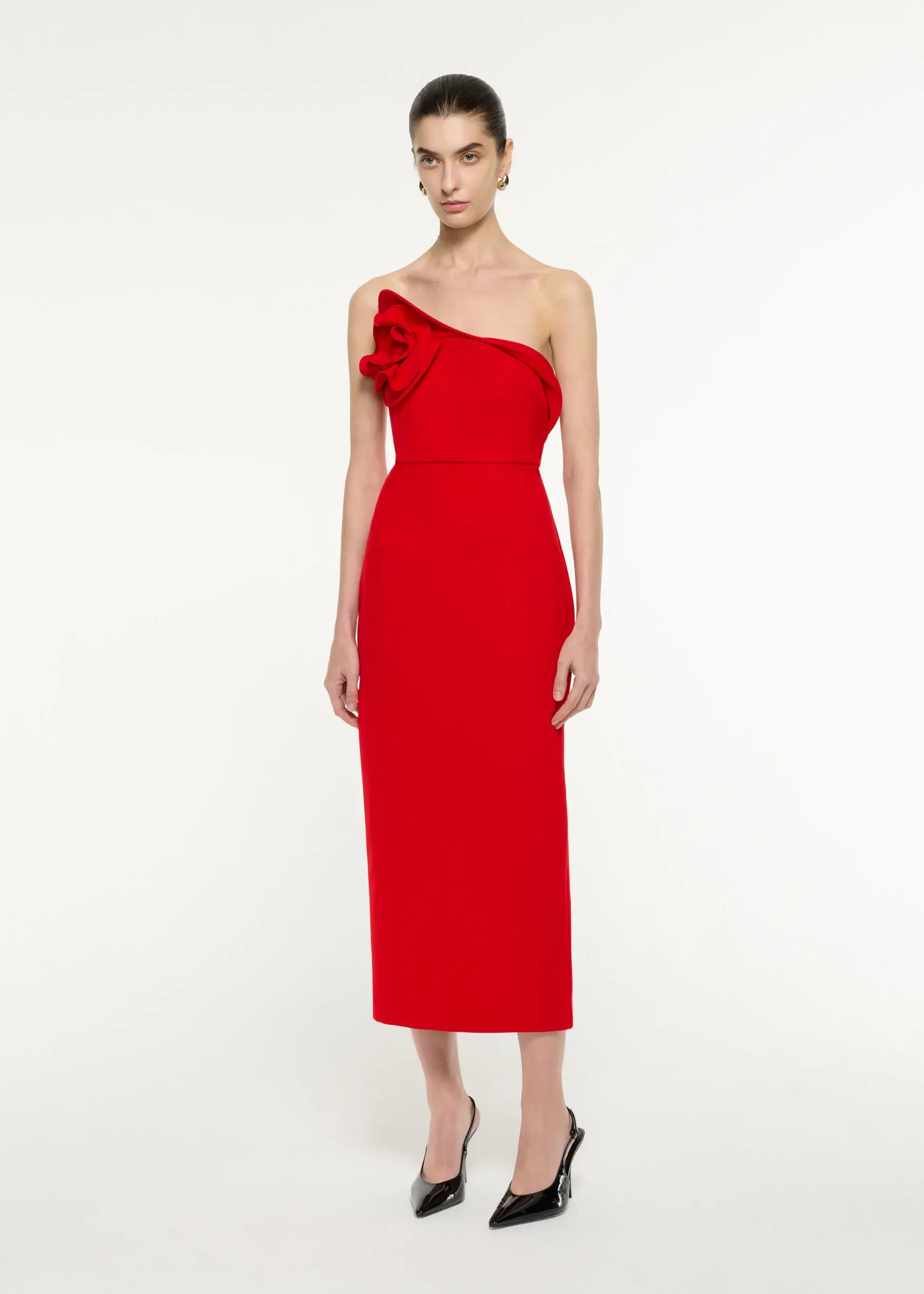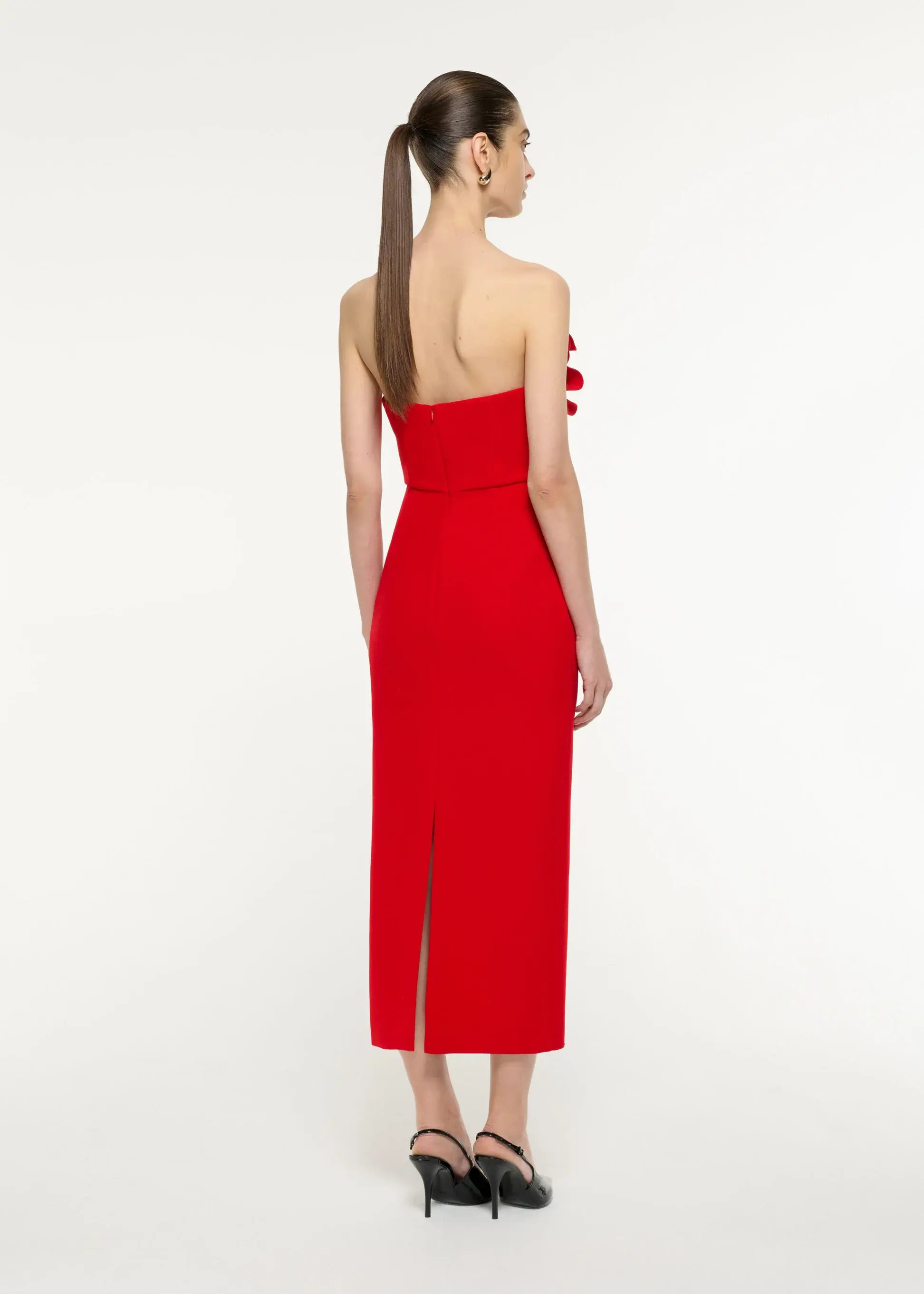 Red strapless crepe midi dress with structured flower motif drape in crepe fabric. Slim fitted dress that falls mid calf length.