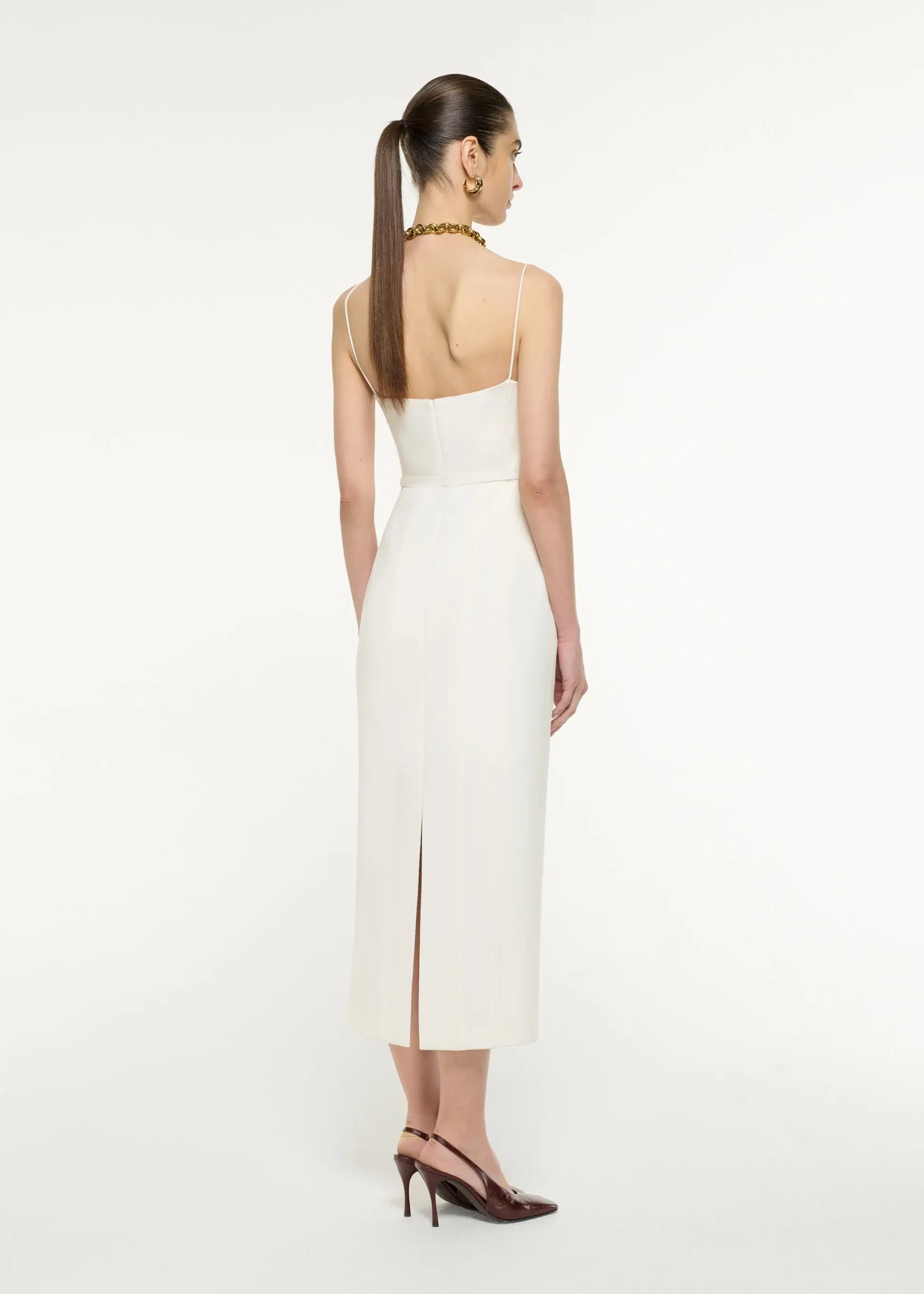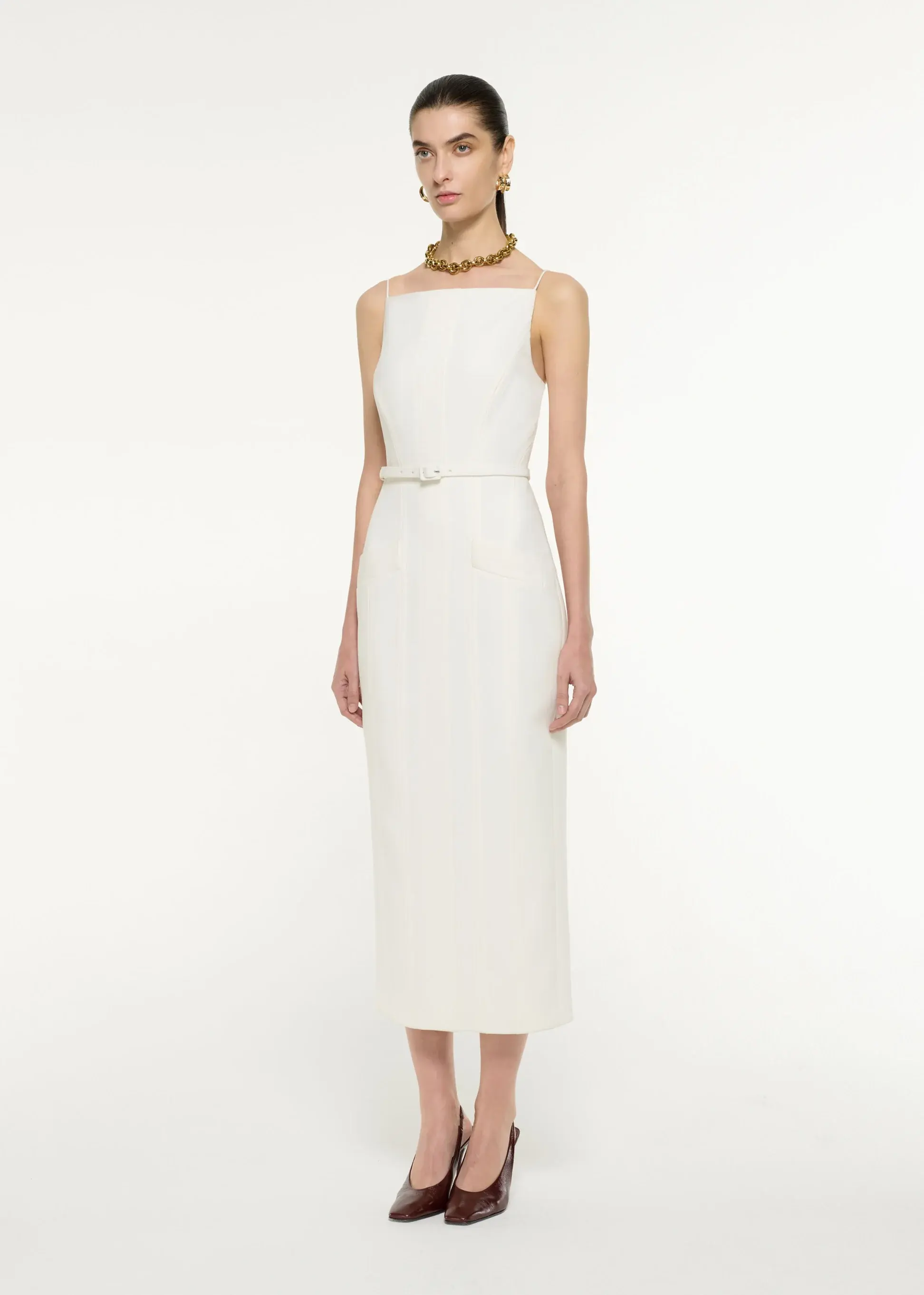 A midi dress in cream crepe fabric featuring a wide placket at the center front and matching imitation welt pockets at the hips. Designed with a high neckline and spaghetti straps for a minimalist look.