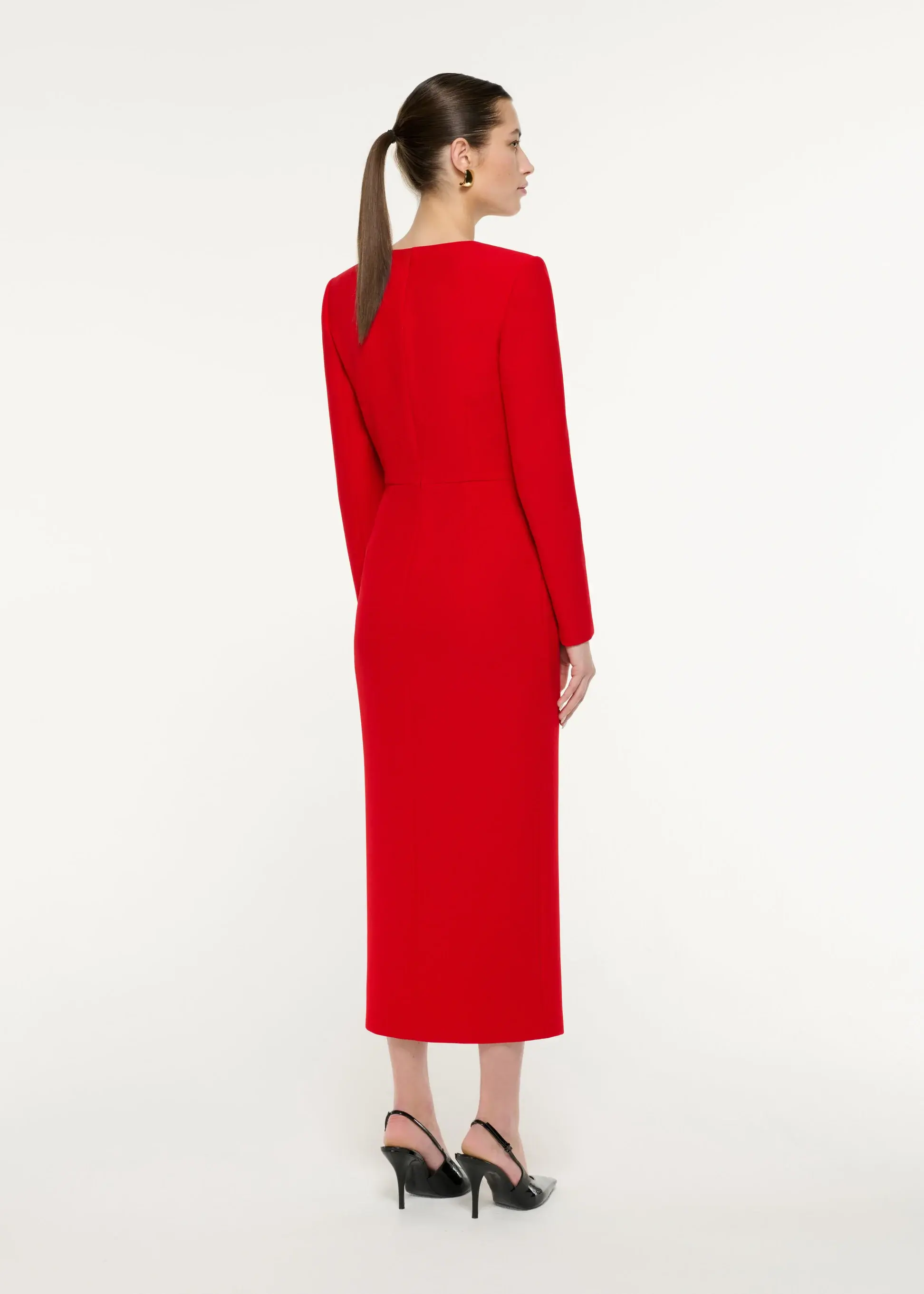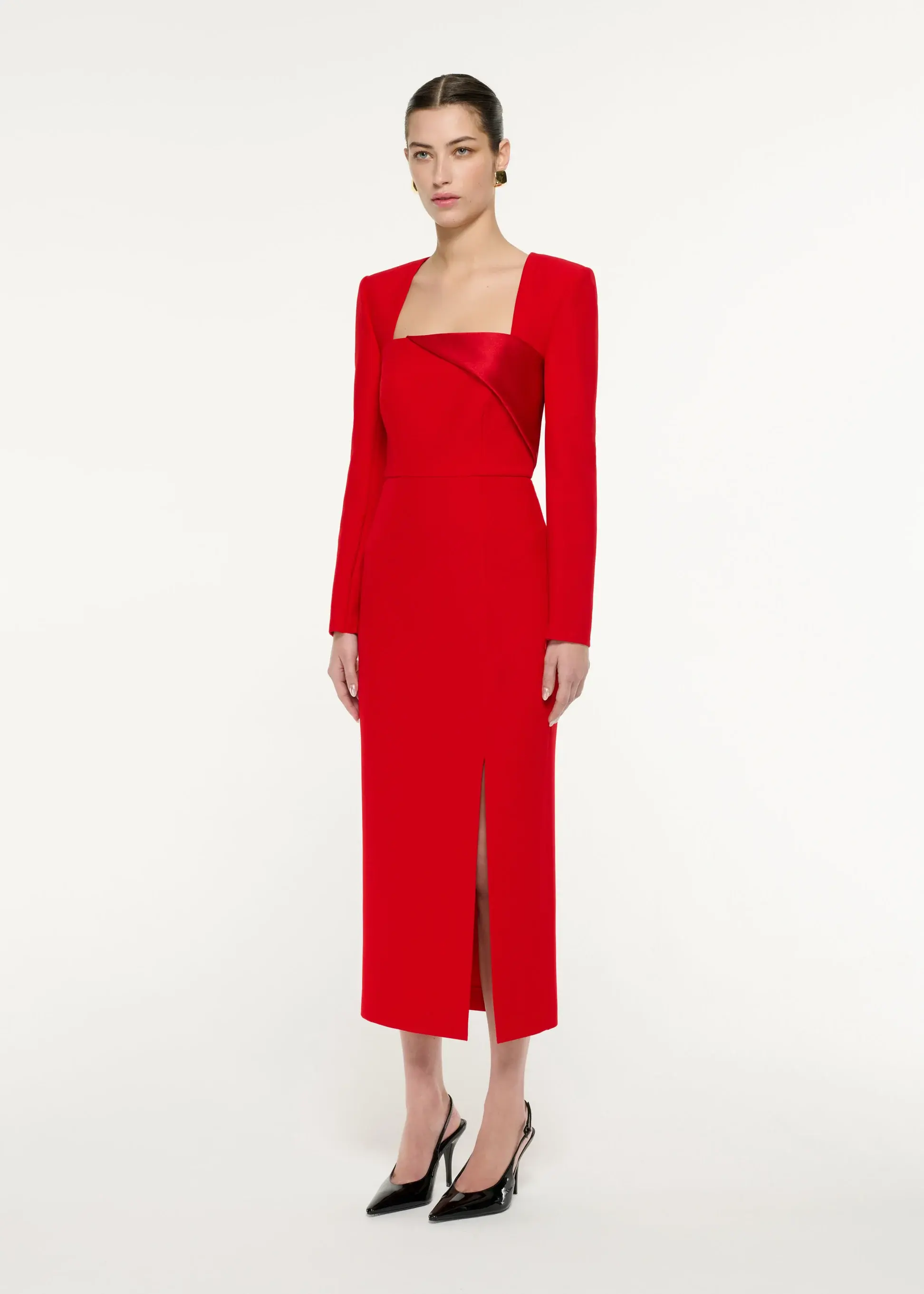 Long sleeve midi dress in our core red crepe fabric. Square neckline with contrast satin diagonal fold going through the front chest and concealed zip on the cuff for slim fitted sleeves.