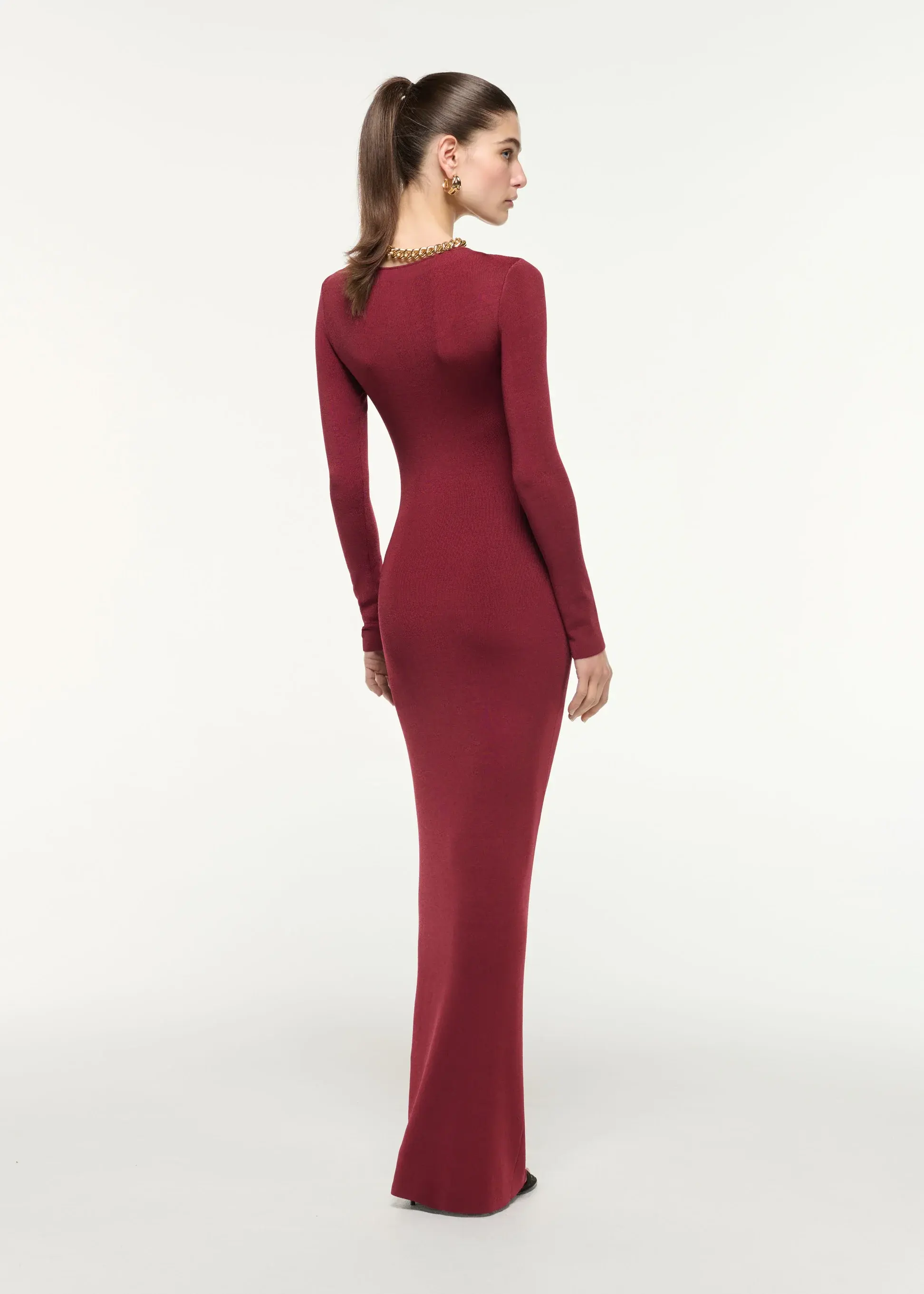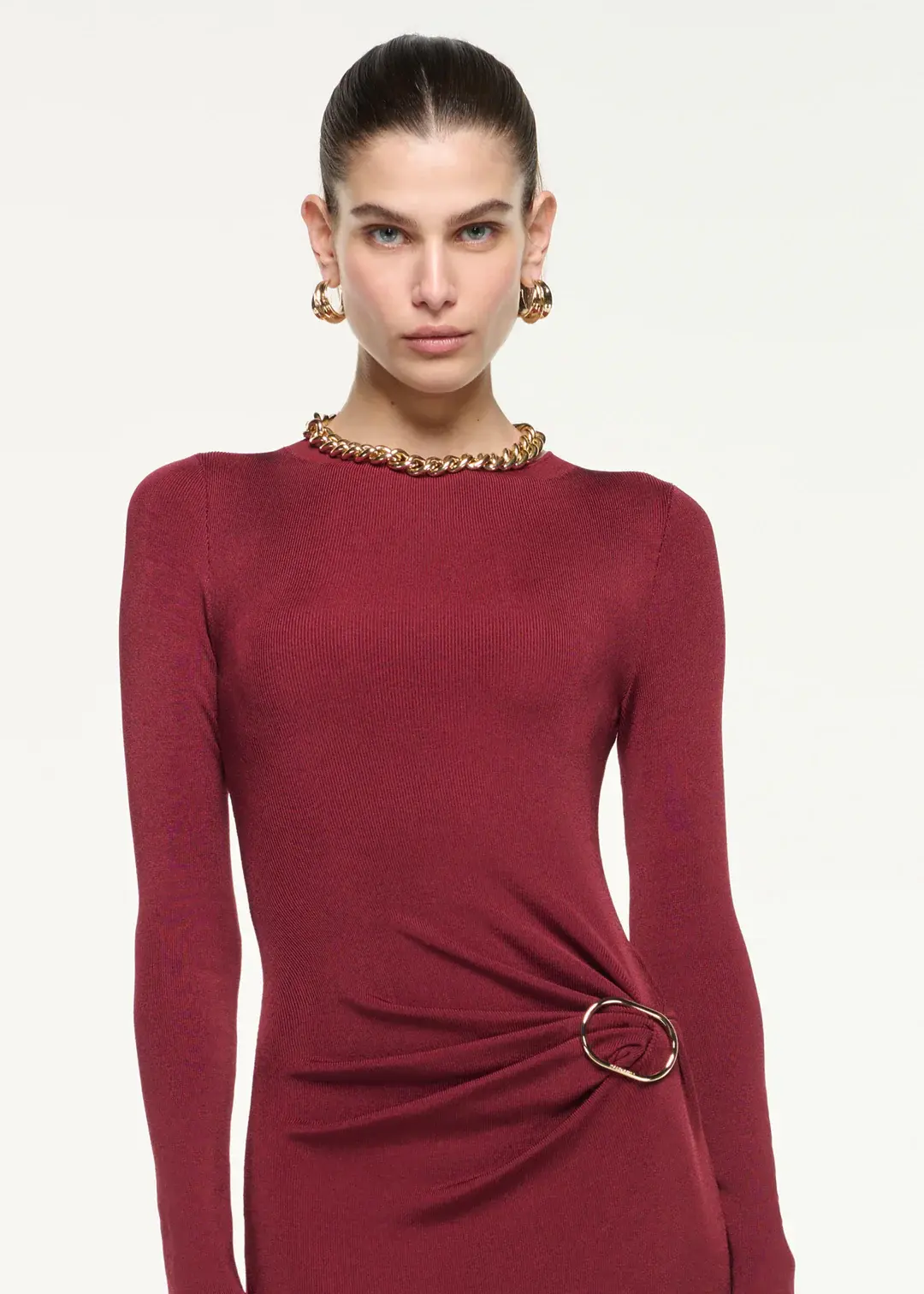 Fine knitted dark red long sleeve maxi dress in viscose with Roland Mouret branded gold buckle at waist.