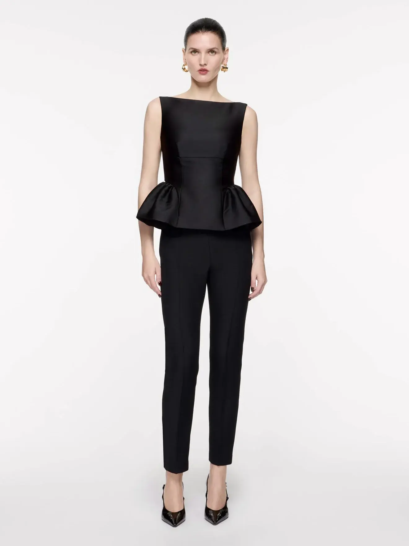 Black cropped trouser in rich wool silk fabric. Features pin tuck at the centre of legs, this is a versatile trouser for any smart occasions.