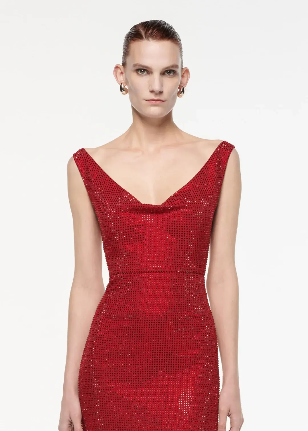 Diamante maxi dress falling to floor length in red. Featuring a pleat at the neckline edge, a front hem split and a concealed zip fastening at the back.