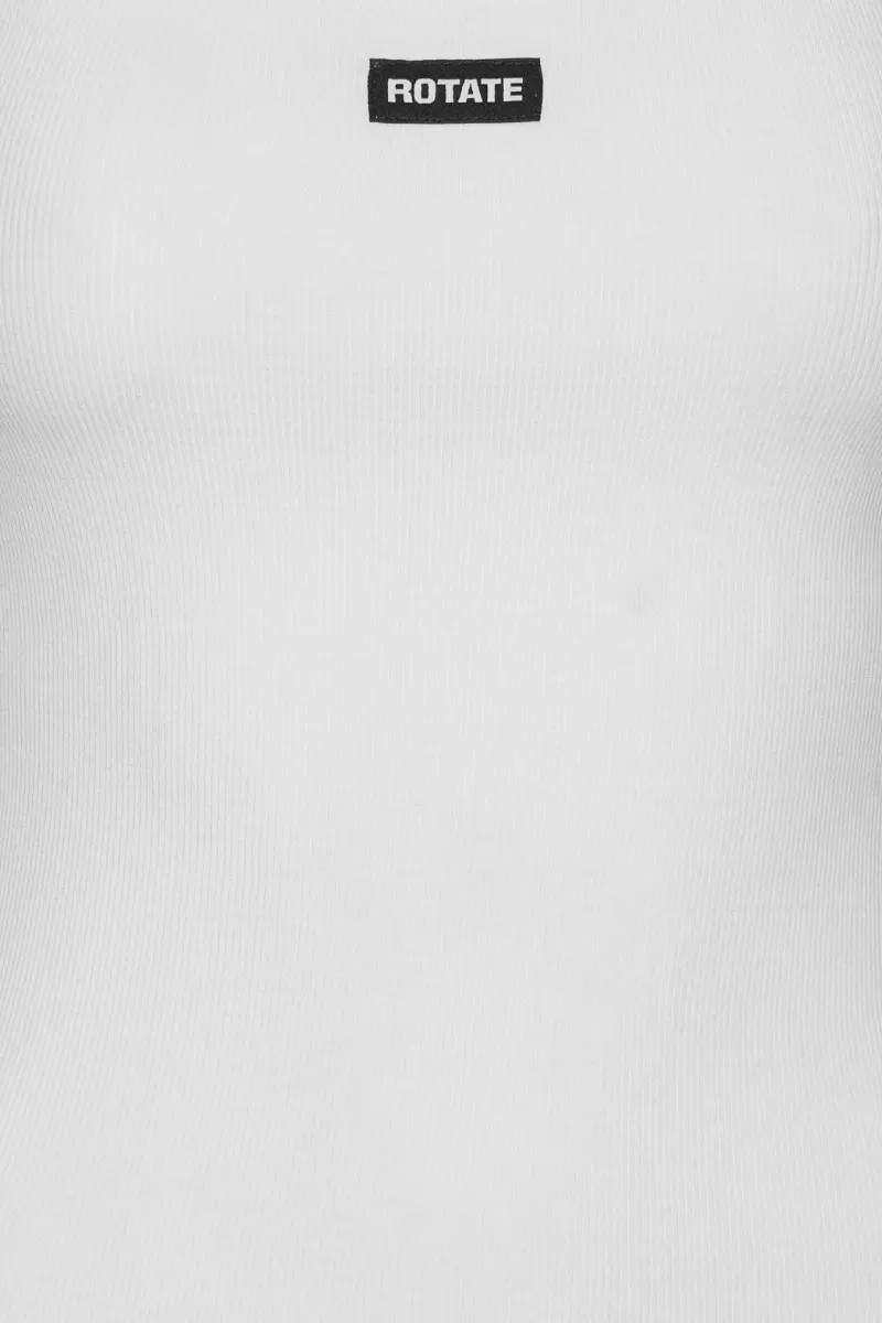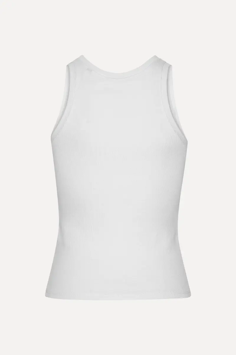 Basic Tank Top White features a round neckline and a relaxed fit through the body. The short sleeves drape softly, while the front includes decorative detailing. A back closure ensures a secure fit.