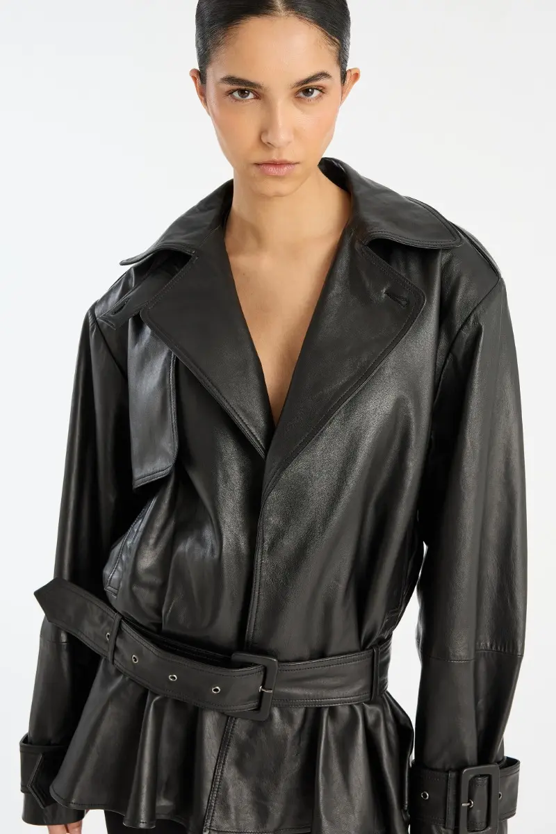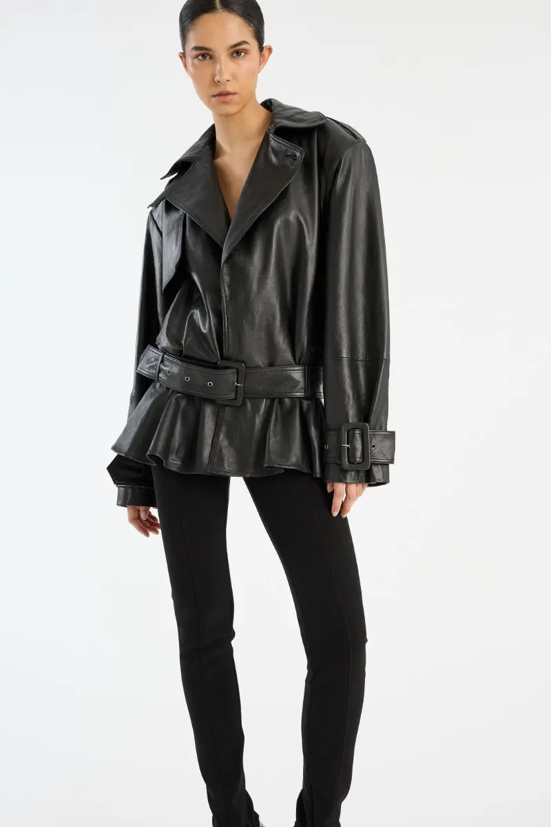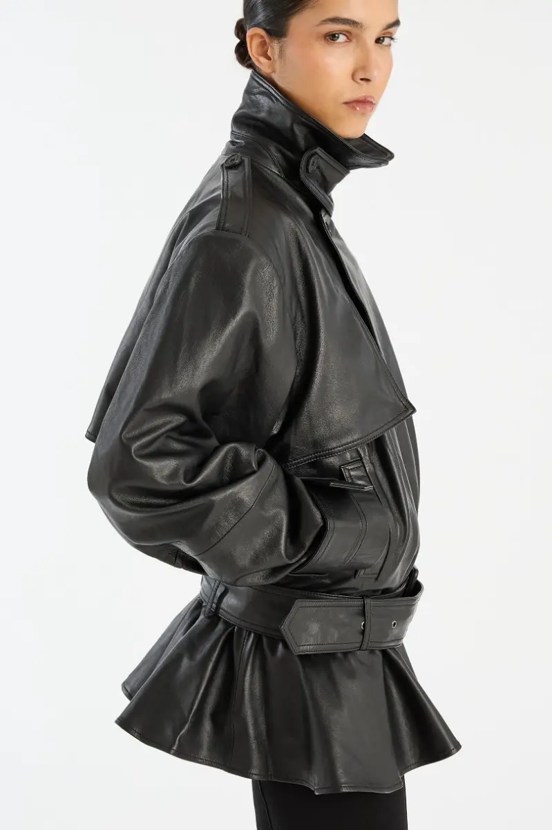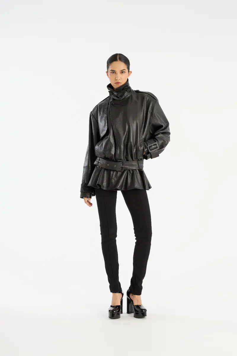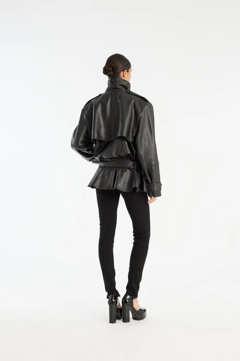 Biker Leather Jacket Black is crafted from smooth lamb leather and features a structured collar, front button closure, and a detachable belt. The hem is gathered in a peplum shape, adding volume to the silhouette. The jacket has lining.