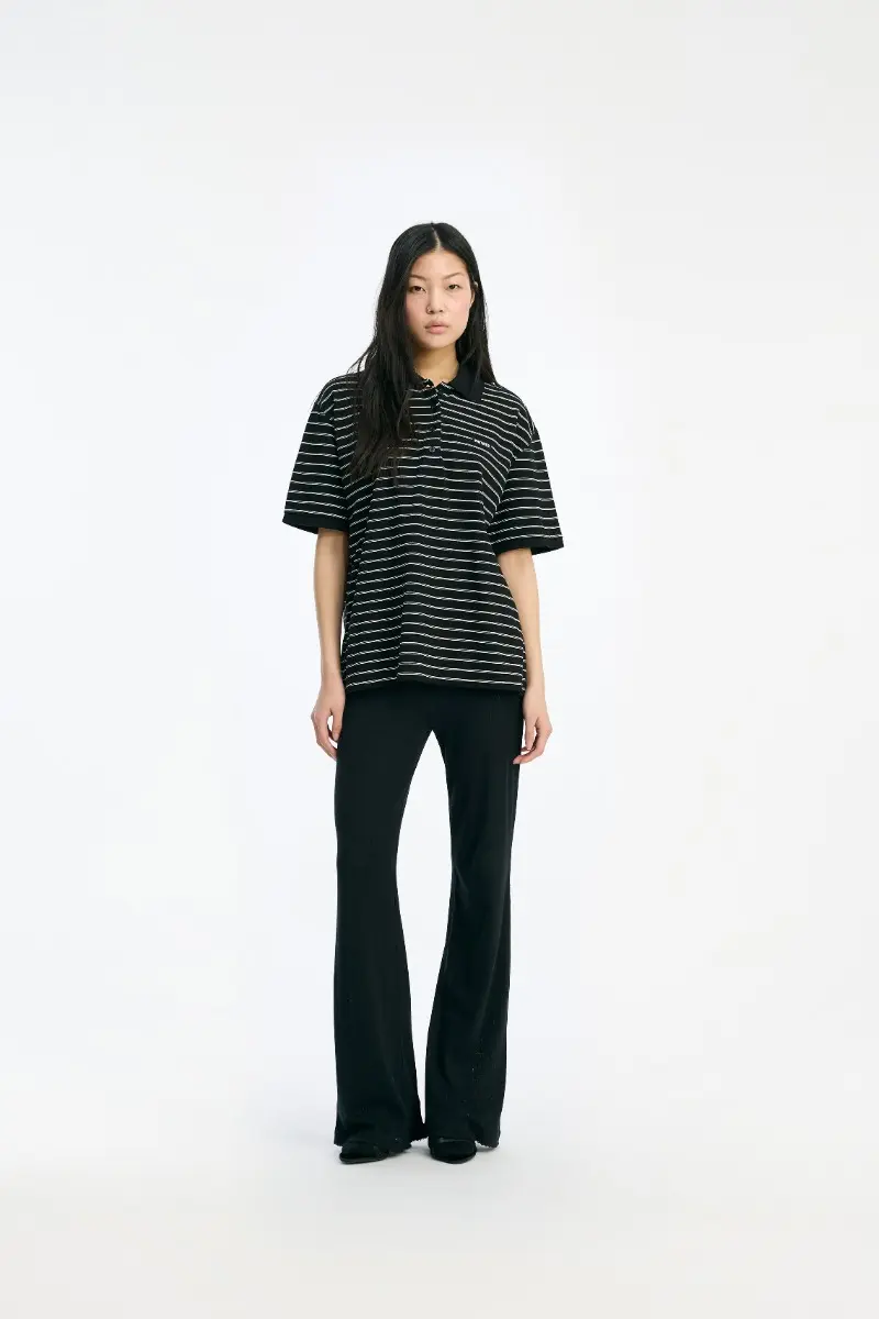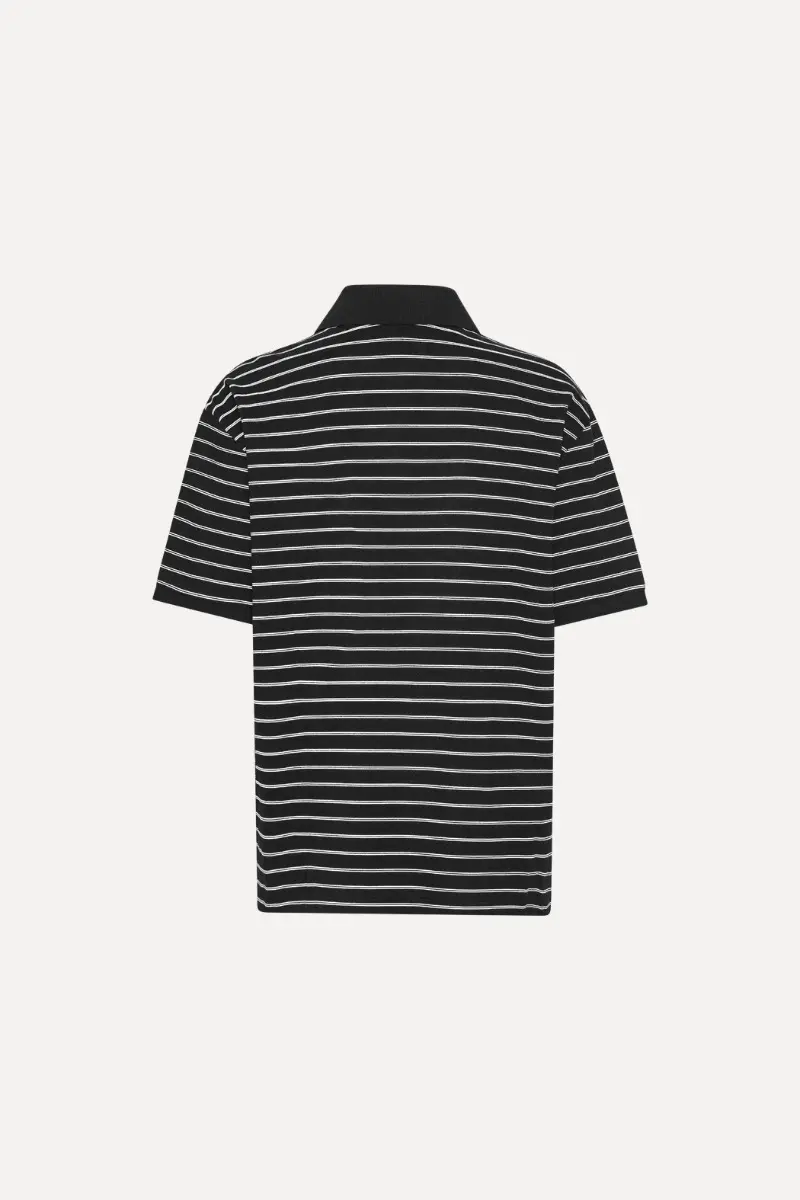 Pique Shortsleeve Polo Black is a short-sleeved polo shirt featuring a ribbed collar and front button closure. Designed with classic stripes and a ROTATE logo embroidered on the chest. Creates a relaxed yet sharp silhouette.