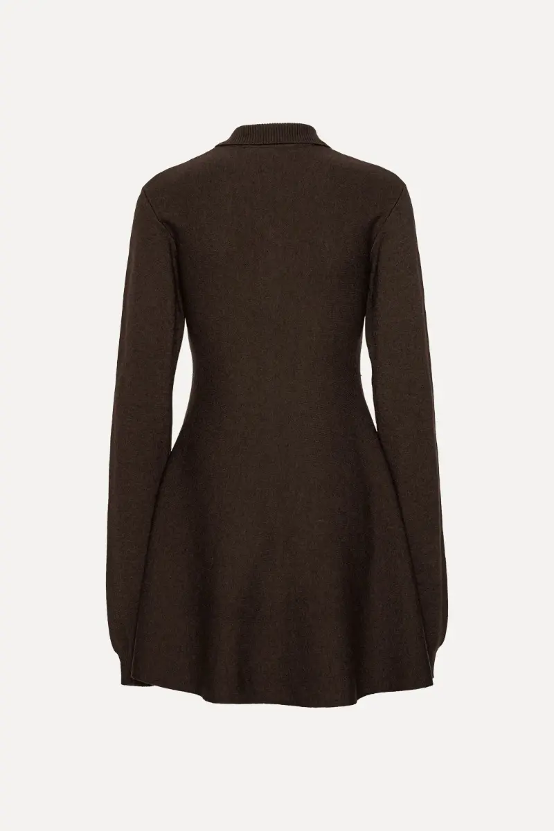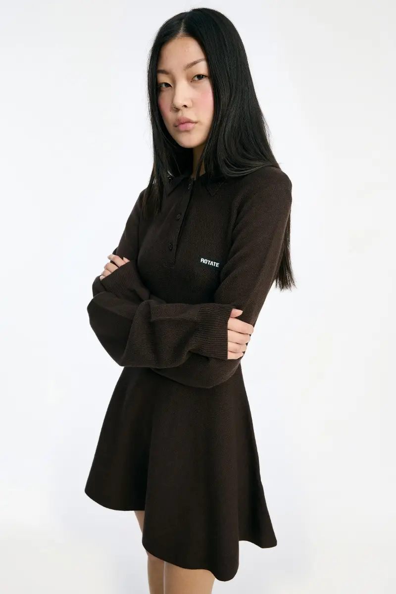 Slinky Knit Polo Dress Dark Brown is designed with a classic polo collar, long sleeves, and a flared silhouette. The front features a button placket with three buttons and a small ROTATE logo patch placed at the chest.