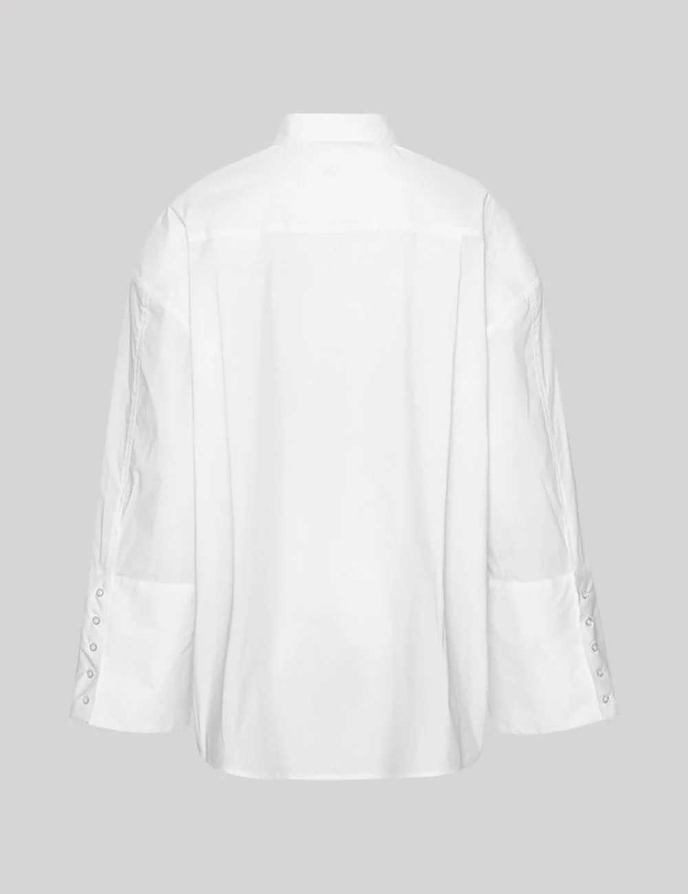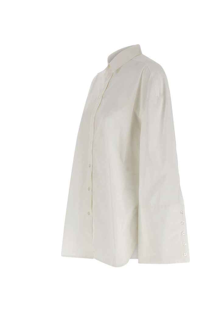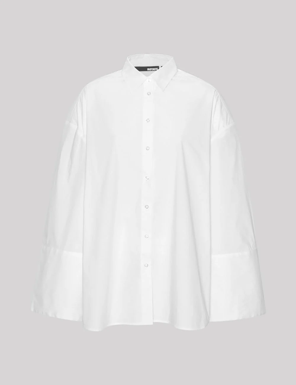 White cotton blend shirt for women by Rotate Birger Christensen. Features a classic collar, long sleeves with extra large cuffs, and a closure with matching buttons. The shirt has a rounded hem with side slits and an oversized fit.