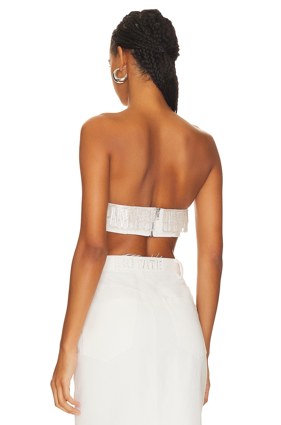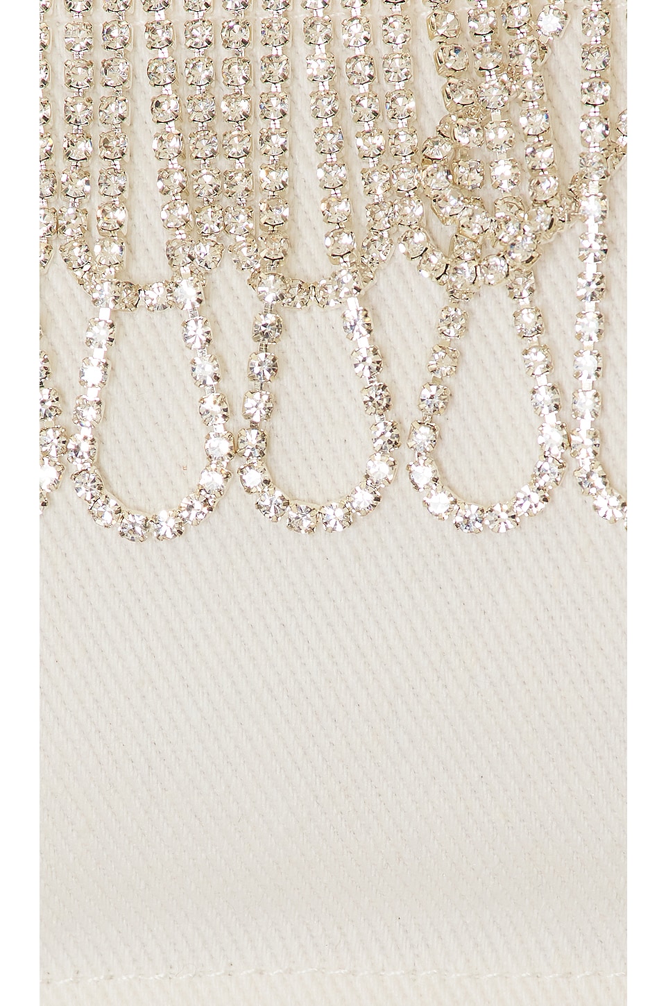 Cotton blend Dry clean recommended Exposed back zipper closure Crystal embellished fringe at neckline Lightweight denim fabric