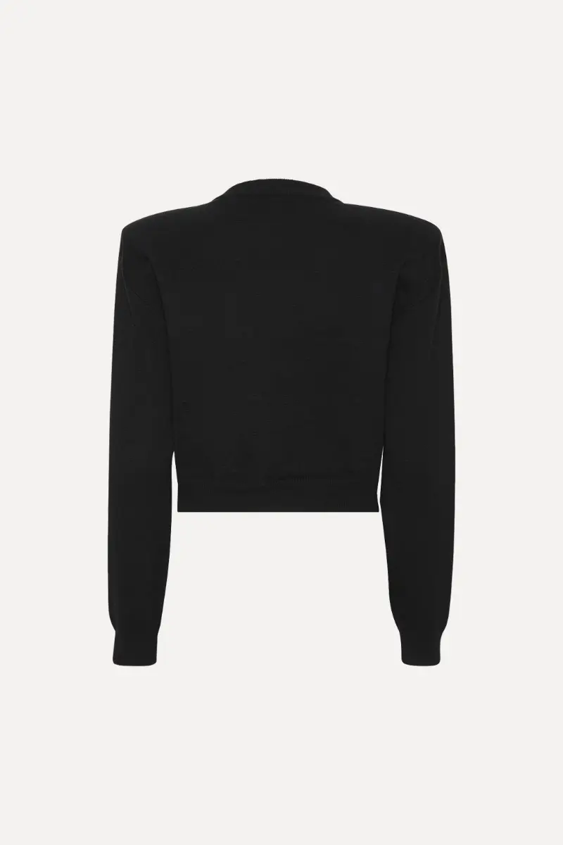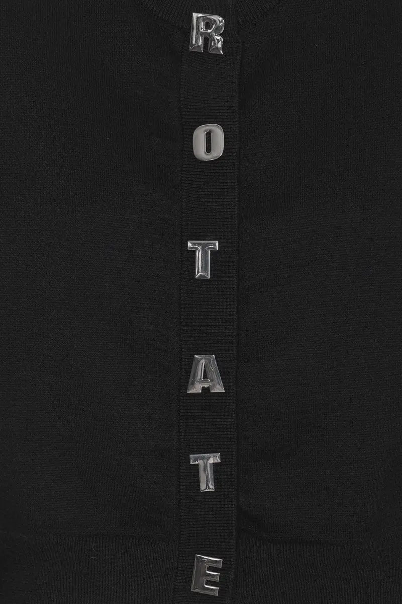 Firm Knit Cardigan Black features a round neckline and a front button closure with metallic letter-shaped buttons spelling “ROTATE.” The design includes long sleeves with ribbed cuffs and a ribbed hemline. The silhouette is structured with removable shoulder pads. The fabric has a soft texture, and the fit is slightly cropped.