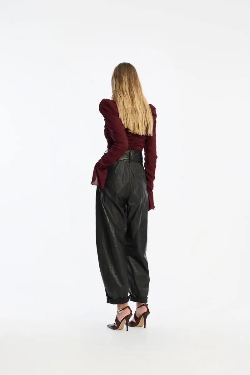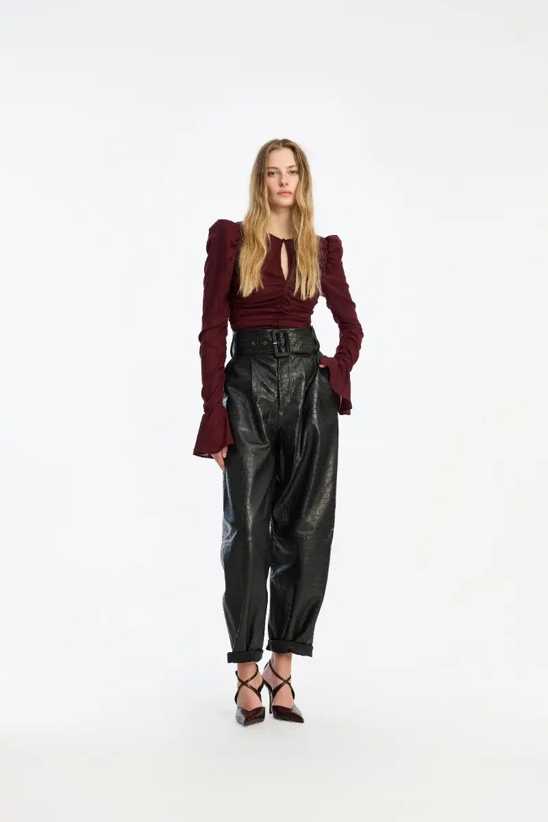 Chiffon Ruched Ls Top Burgundy has long sleeves with gathered detailing and flared cuffs. Designed with a round neckline and teardrop opening at the front, it features ruched seams at the front, back, and sleeves. Closes with a zip at the back. Composition 1: 100% Polyester (Recycled)