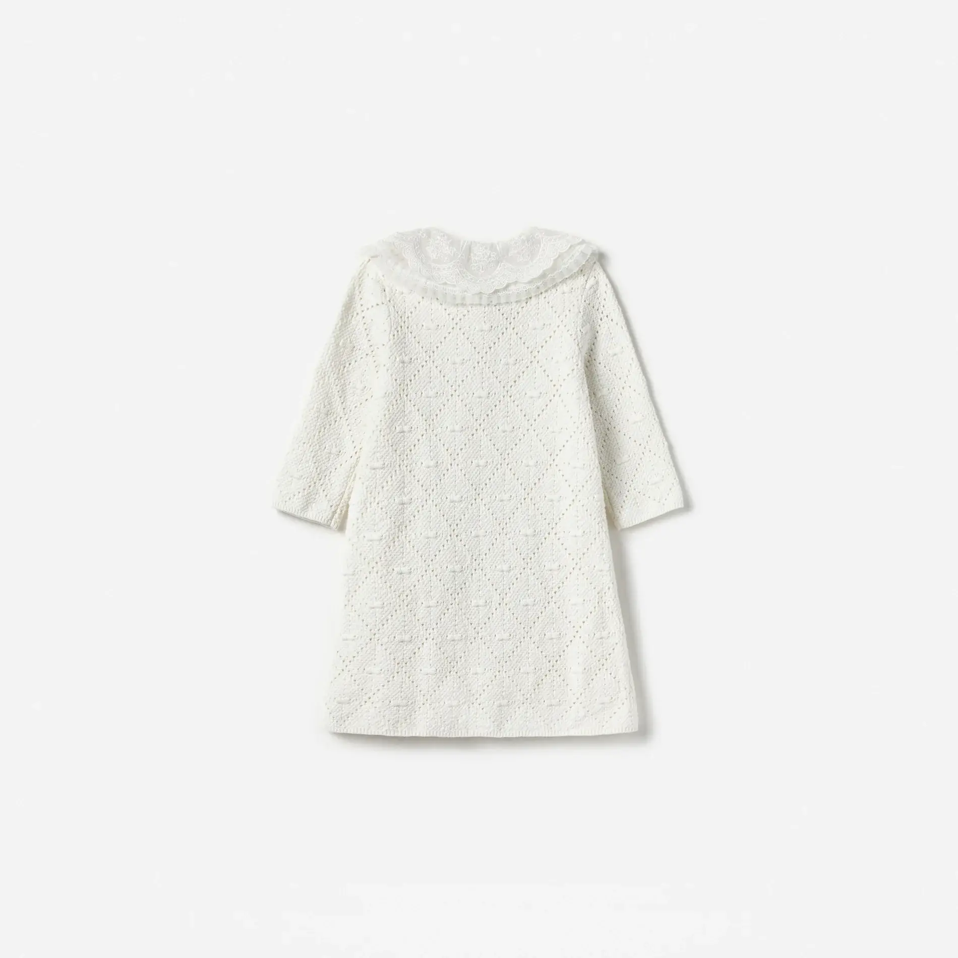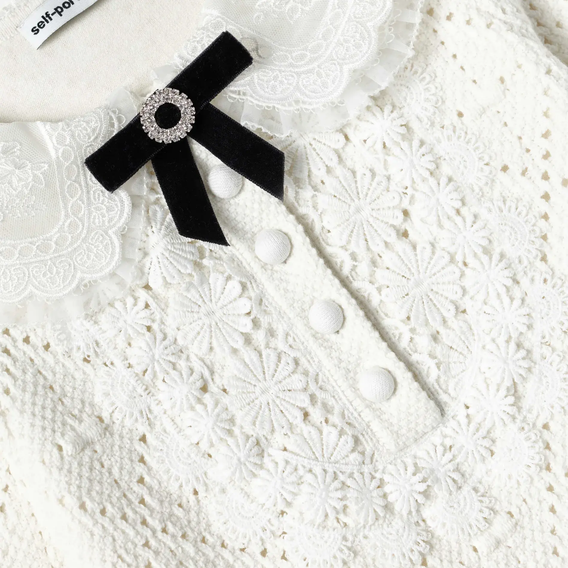 Ideal for when a lucky someone is feeling extra lady-like, this white pointelle knit dress stars floral lace trims and a bow-topped embellished bib. Add our bedazzled headband for extra charm.