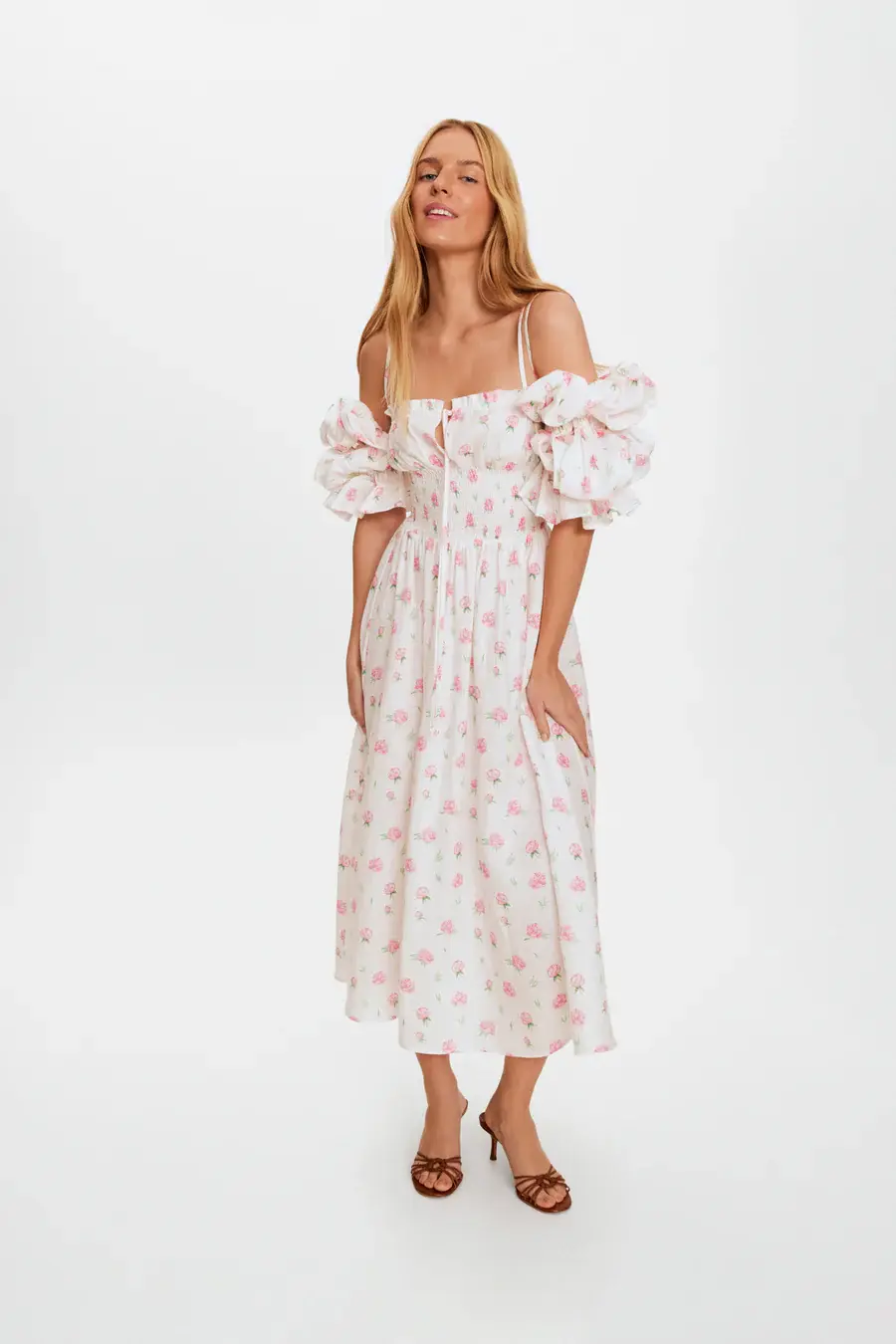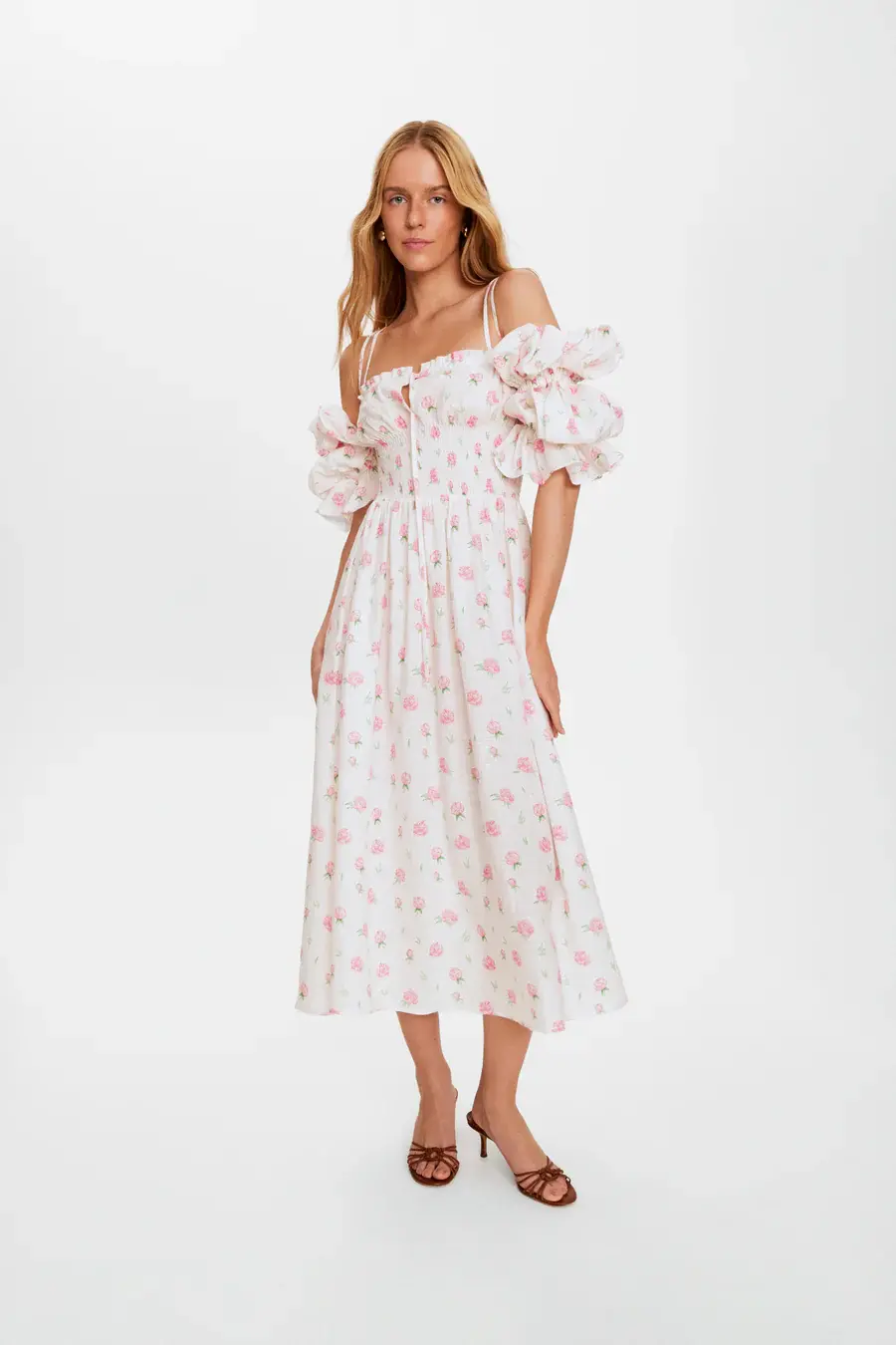 This dress is basically a picnic invitation. Made from 100% linen and printed with delicate pink roses, the Arle Midi Dress is your warm-weather fairytale come true. It features double shoulder straps, a smocked bodice for a flattering fit, and bold off-the-shoulder puff sleeves for maximum romance. The midi-length skirt is soft, floaty, and fully twirl-approved.