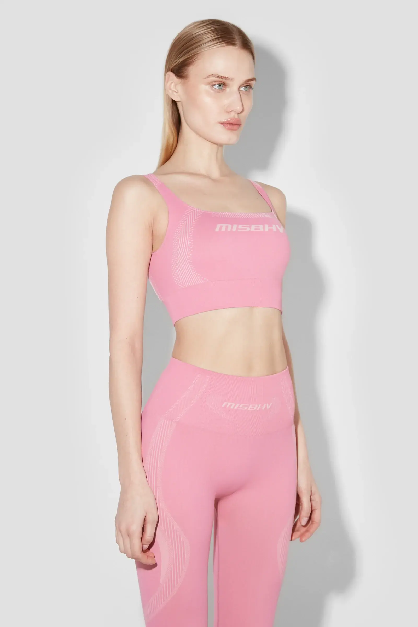 Pink breathable stretch recycled jersey bra. Jacquard stripes and check pattern throughout. Square neck Rib-knit collar and hem Jacquard logo at front