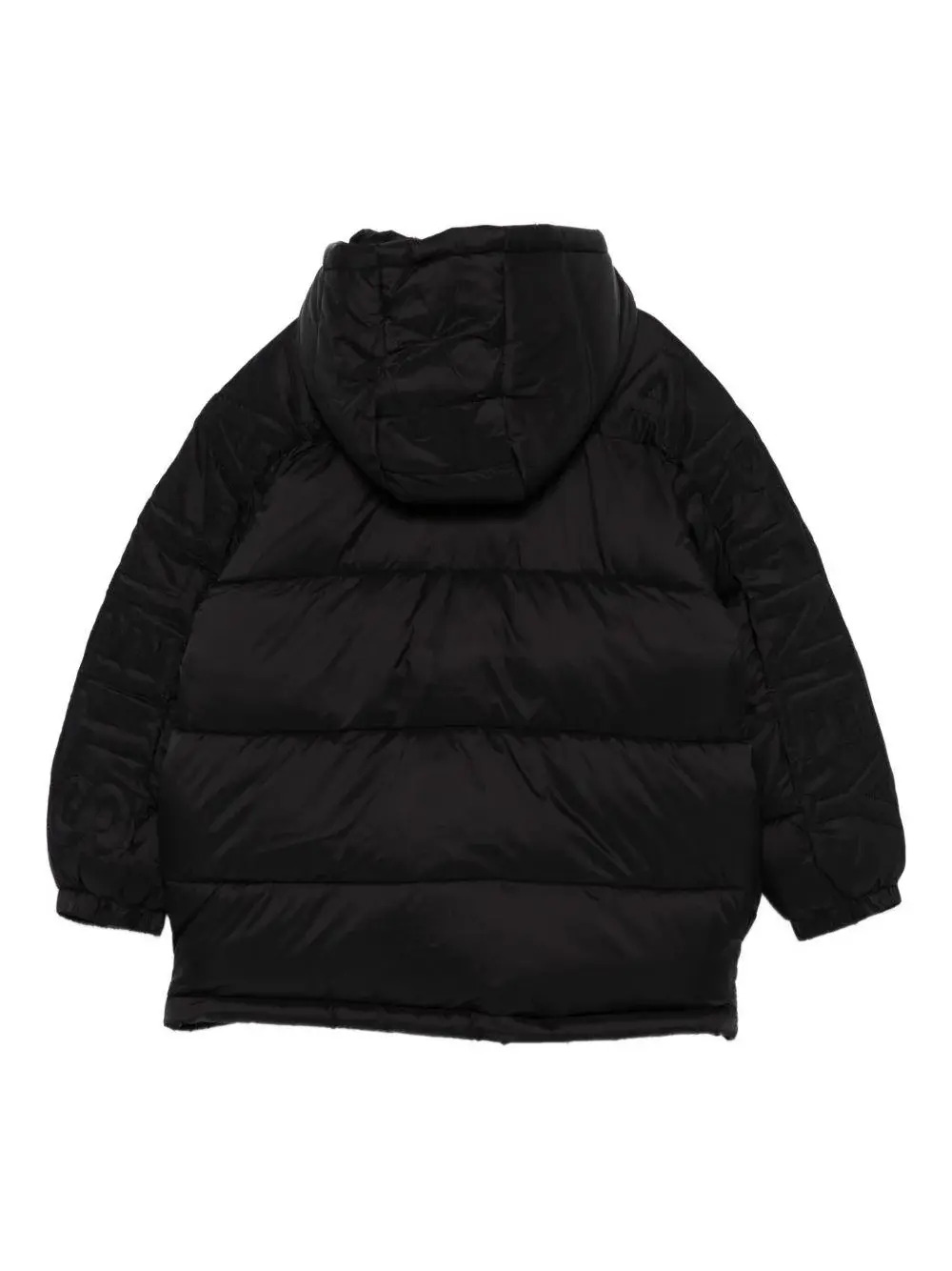 Made of 100% polyester, it features a black color, a quilted design, zippered chest pockets, and a hooded neckline