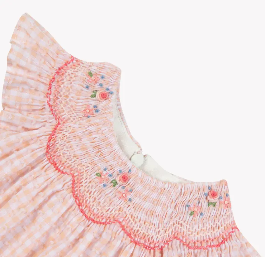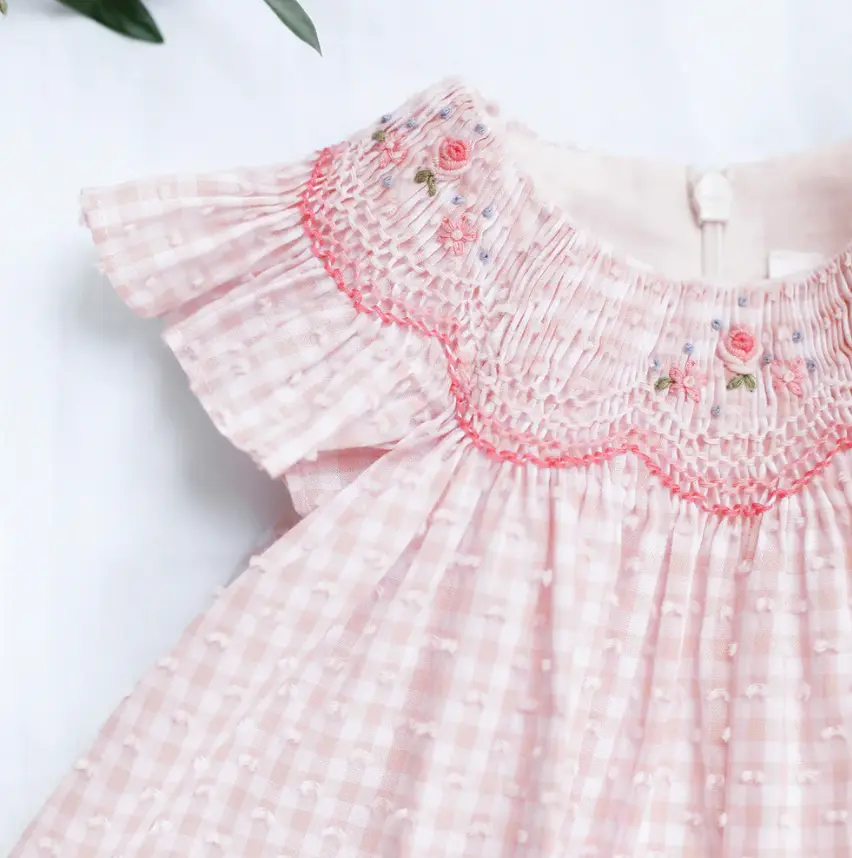 - Plumetis to Check Pink and White. - Flowers Embroideredare by hand. - Zip fastening on the back.