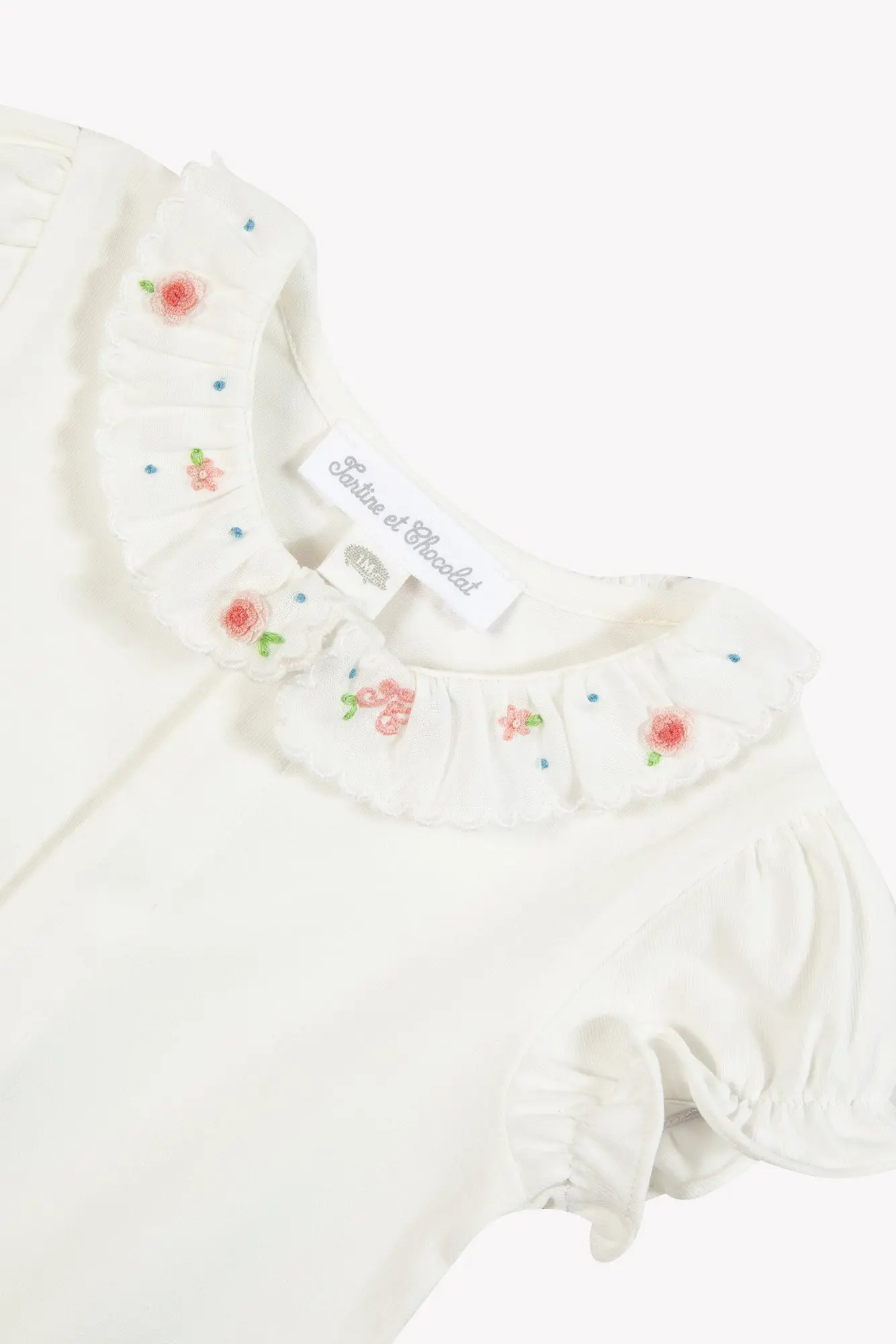 - Ruffled collar with hand embroidery flowers. - Puffy sleeves for a charming style. - Ideal for the keychain Newborn.