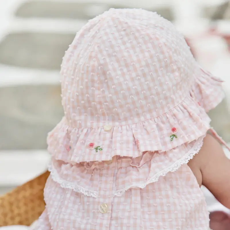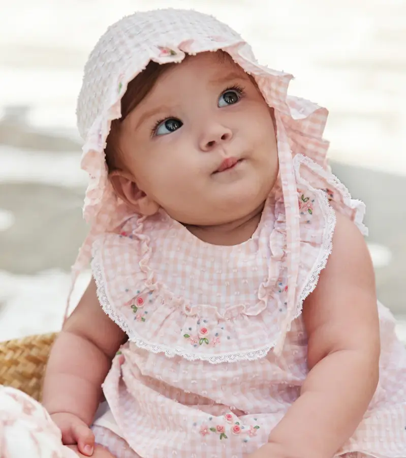 This fabric bucket hat Two-tone gingham Pink is an adorable accessory to complete the first trousseau girl. With its floral embroidery details and adjustable design, it combines practicality and charm for little explorers. Perfect for sunny days, it protects in style. To be combined with a Dress lightweight cotton for a soft summer look.