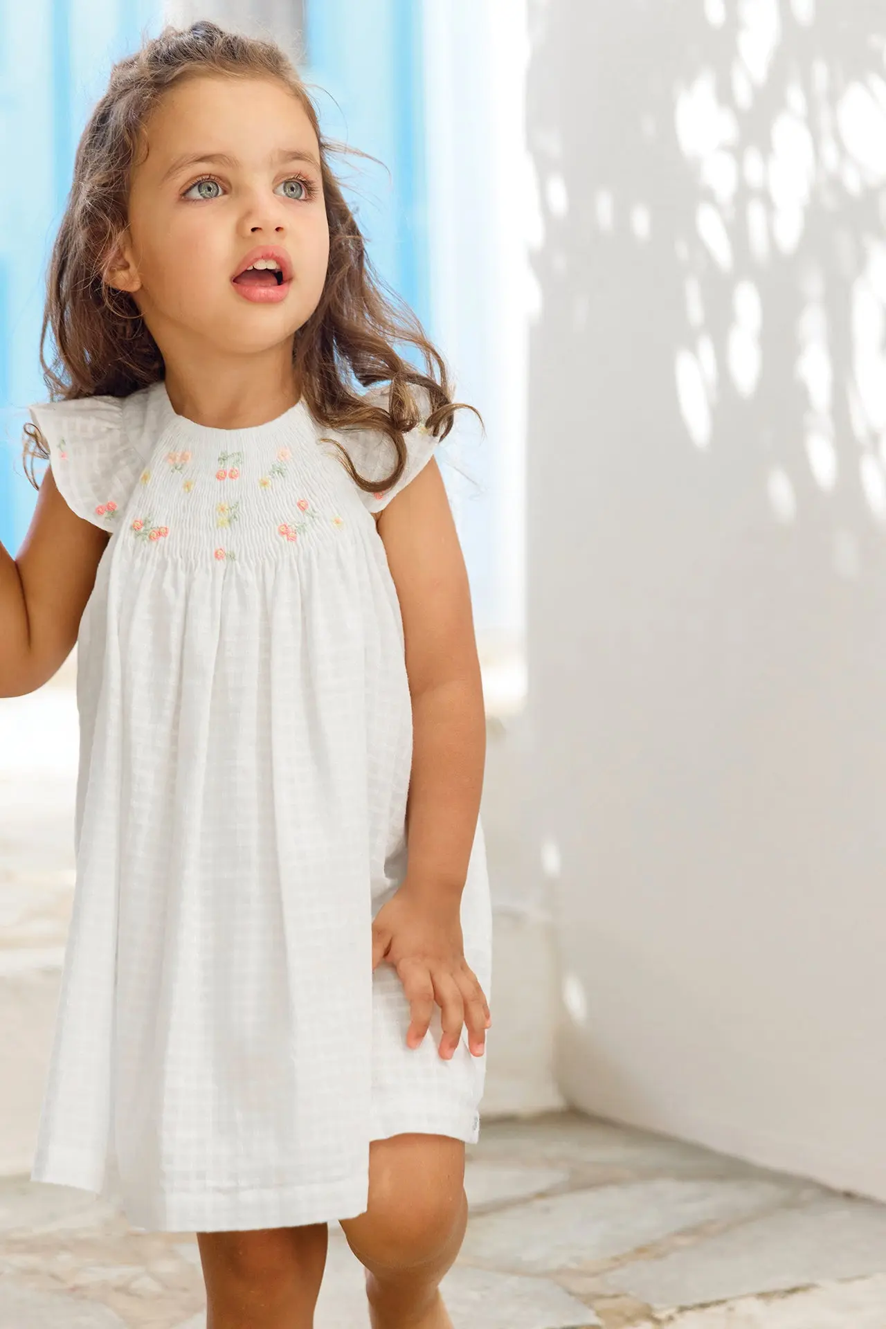 This Dress white is a real enchantment with its hand floral embroidery and its shaped veil. Perfect for a little one in a "fantastic baby garden", it offers refined elegance with its smock details and Buttons in the back. Ideal for special occasions, it combines comfort and style, in 100% cotton.