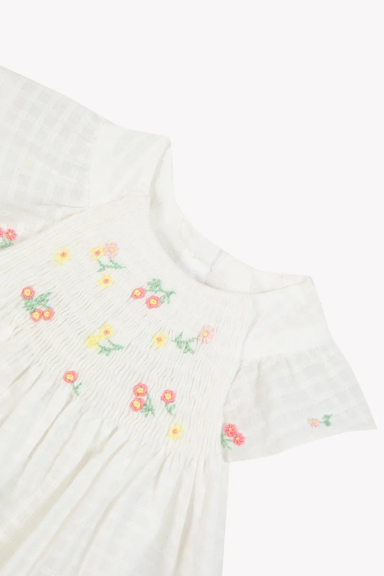 - Hand floral embroidery. - Delicate smock detail. - Buttons on the back for an elegant touch.