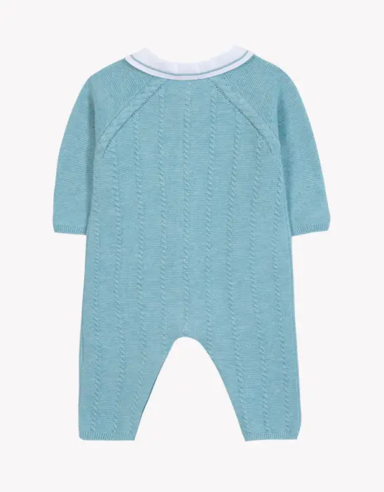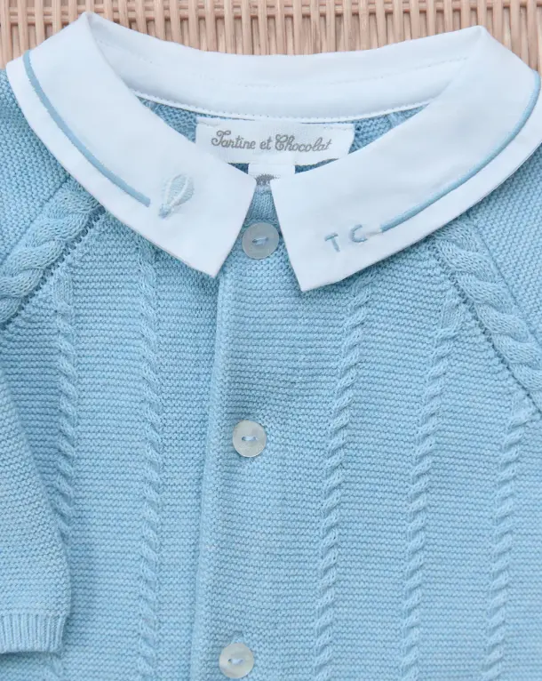 This Jumpsuit long in Blue with a Pointed collar is perfect for the first boy's trousseau. In Knitwear CableSoft and made from 100% cotton, it combines comfort and style for your little prince. The Collar White with a finish Sky blue and TC adds a touch of elegance. Ideal for first outings Baby, it can be matched with Slippers in Knitwear for a complete look.