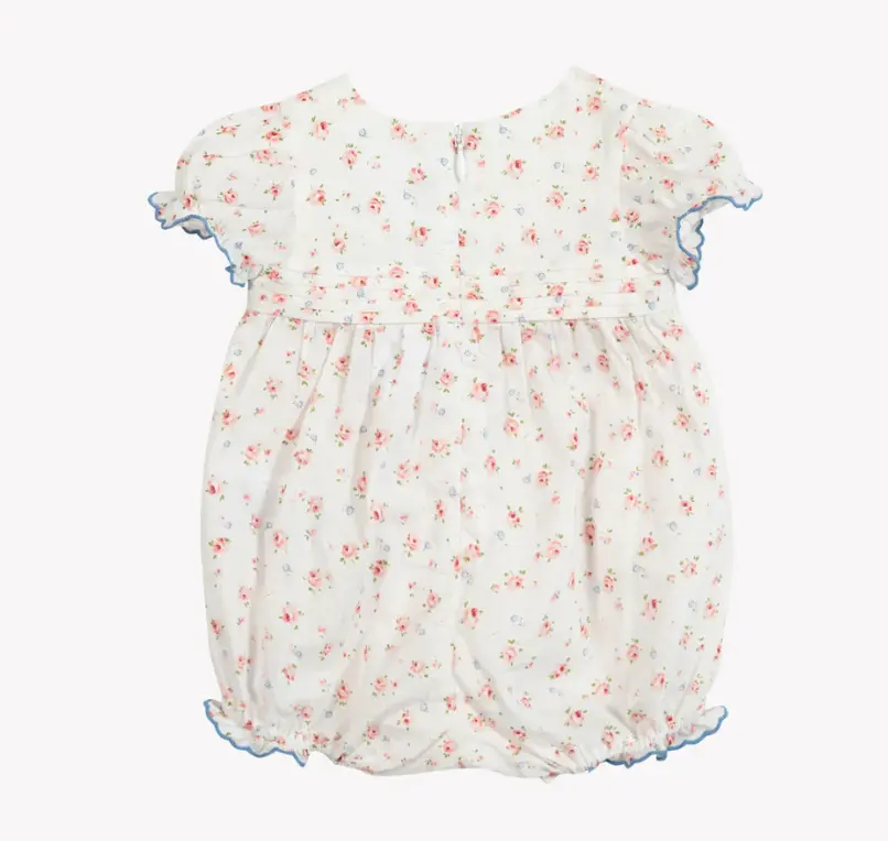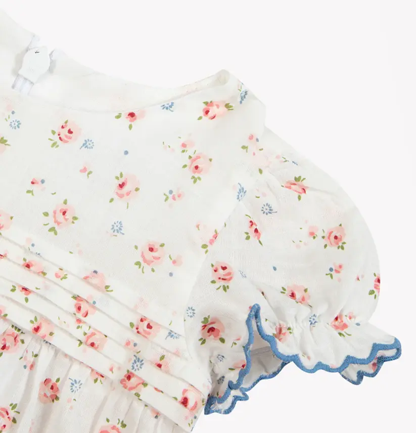 This Jumpsuit short ecru cotton is a delicate piece for little girls' first trousseau. With its floral patterns and border finishes Blue, it adds a touch of freshness and elegance. Perfect for sunny days, it ensures comfort and style for newborns. To be combined with a Beanie in cotton for a complete look.