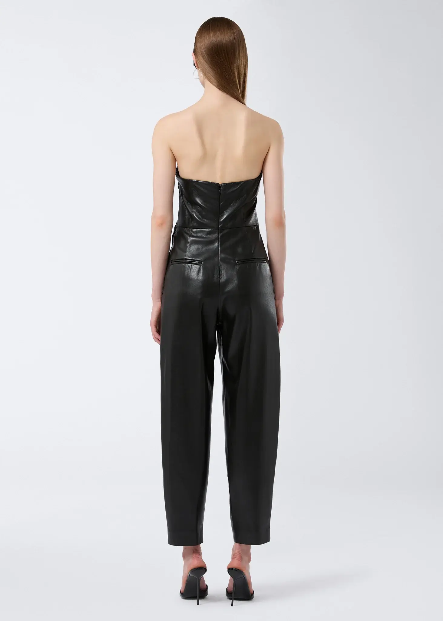 The Yana sleeveless jumpsuit is cut from black vegan leather. Featuring a bustier neckline that is secured in place with a zip fastening at the back, this women’s jumpsuit is elevated with subtle layers of draping. The addition of a hidden pocket at the front lends the piece a functional finish, while the cinched waist creates a feminine silhouette.