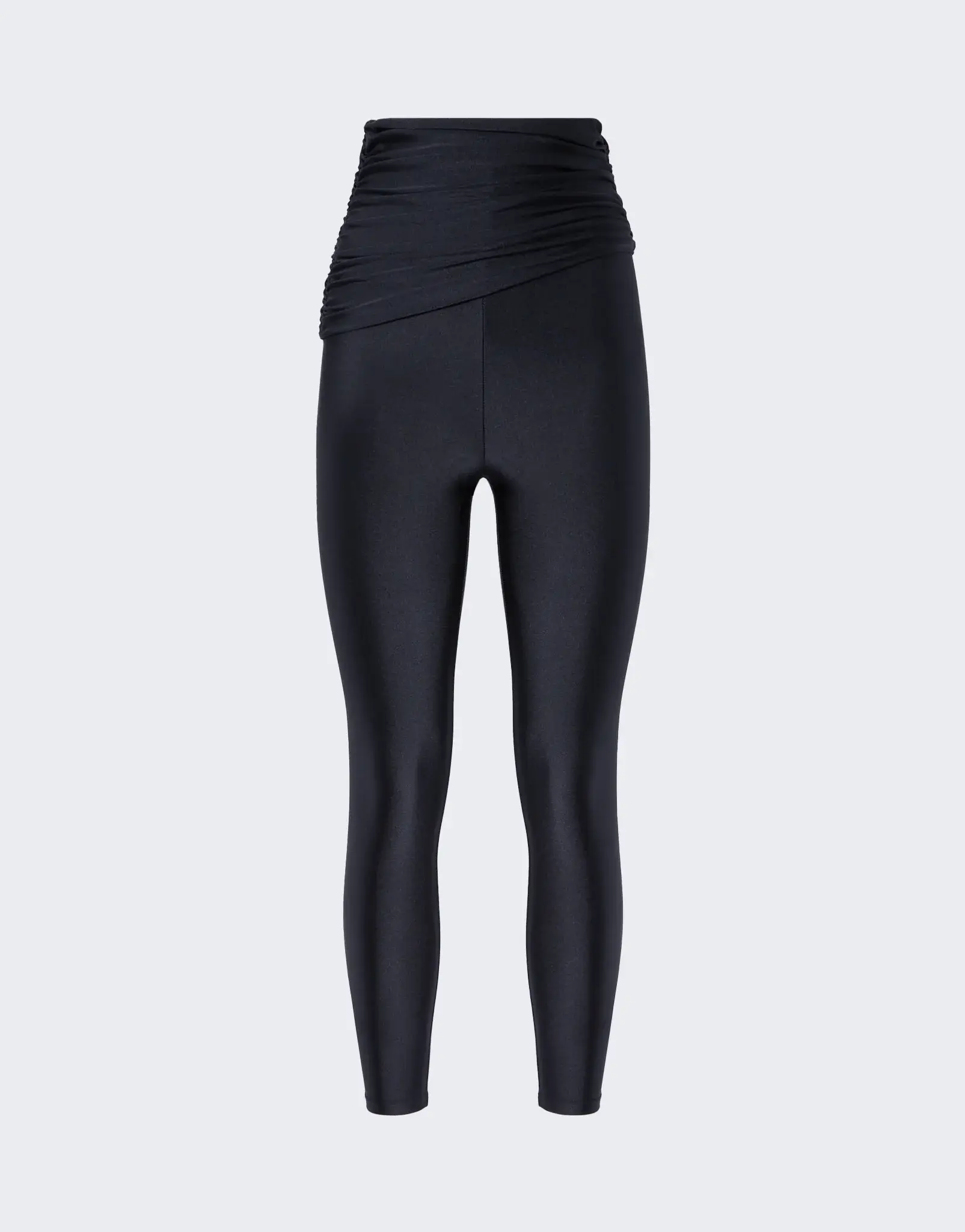The Vicky legging pants for women are made from versatile black shiny lycra and feature a draped high waist. The body-contouring design extends to the ankles, combining a fluid aesthetic with a sculpted fit for a statement-making silhouette.