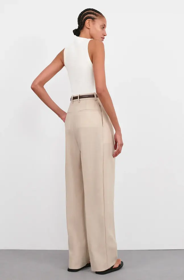 A considered trouser, designed with a mid-rise fit and clean lines. Cut in a light Italian virgin wool suiting selected for its subtle malfilé texture and rich artisanal finish. Features include belt loops, side slit pockets, and a single pleat that enhances the easy drape.