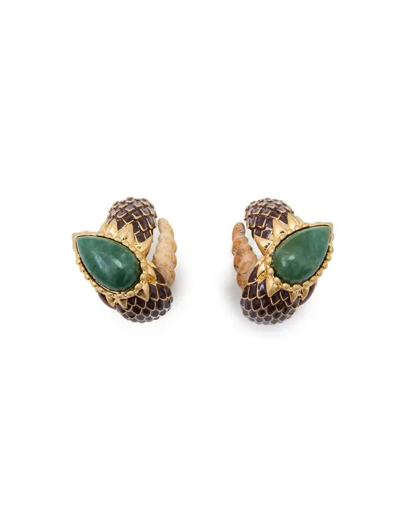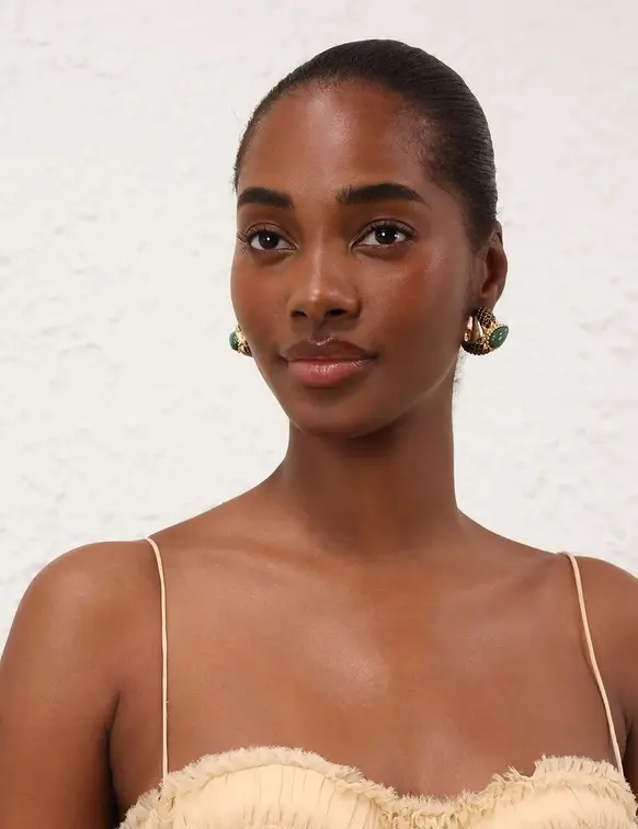 The Naia Earrings in Antique Gold/Multi from our Cruise 2026 Collection, Twisted Romance. A gold plated statement earring featuring a stud post back and diamond surface texture. 16KT gold plated brass earring Natural brown obsidian stones African greenstone centre Palm tree detailing Stud post back Sold as a pair