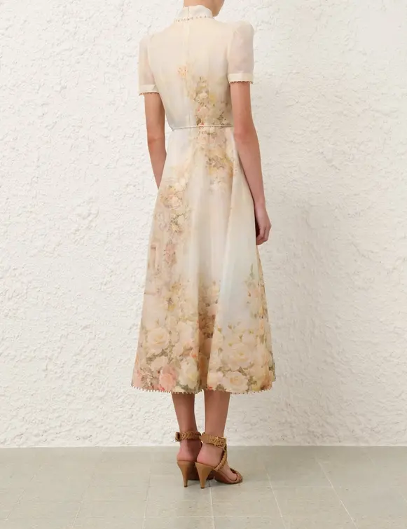 The Memento Picnic Midi Dress in Rose Arbor from our Fall 2025 Collection, Hypnotic. A silk linen midi dress featuring a stand collar, removable waist belt, centre back zip, finished with a flared skirt. Silk linen blend midi dress Short sleeves with subtle puffed shoulders Self rouleau waist tie with flower detail Invisible zip closure at centre back Beaded trim at the neck, cuffs and hem Placement printed Fully lined